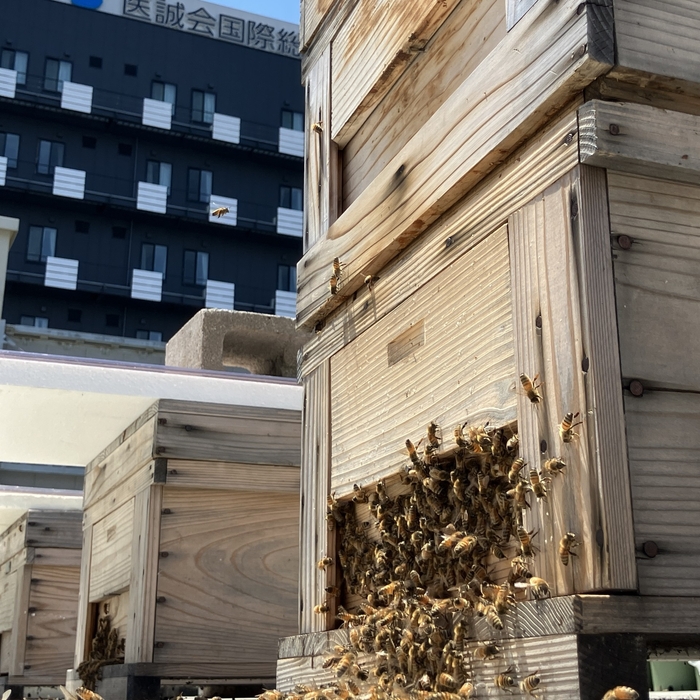 医誠会国際総合病院の屋上にある養蜂場でも、夏の訪れとともにミツバチたちが忙しく活動を始めています。真夏には屋上表面温度が50度を超えることもある過酷な環境の中、ミツバチたちは巣箱の温度を下げるために羽を羽ばたかせ、風を送り、互いに支え合いながら営みを続けています。養蜂場内に水飲み場を設置していますが、施設周辺の水場で羽を休める姿が見られます。ミツバチはむやみに人を刺すことはありません。注意をはらいながら、彼らの働きと存在を、どうかそっと優しく見守ってください。