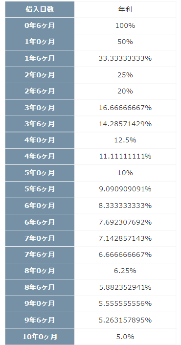 そうすると、下記のように借入期間を6ヶ月ごとと仮定して最大10年までの年利が表示されます。