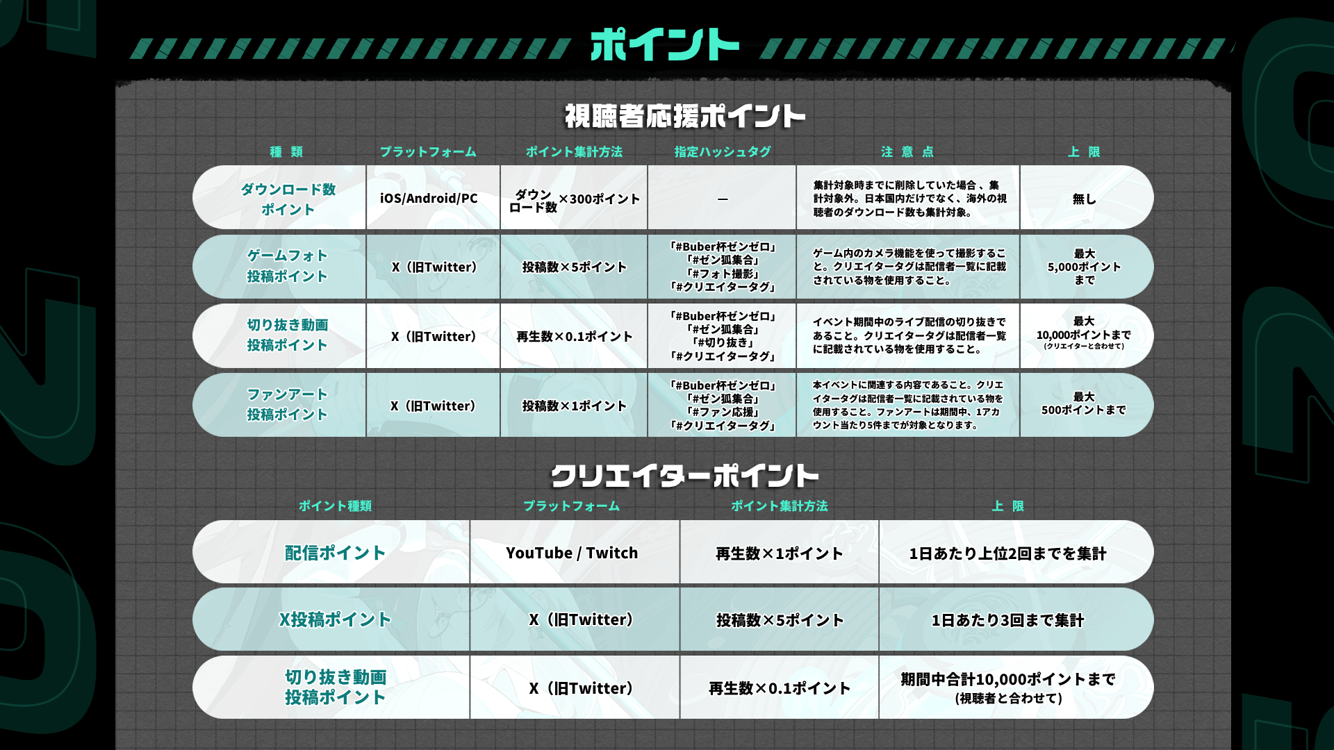 配信者対抗戦イベントは配信者がポイントを競うイベントとなっております。YouTube/Twitchでのライブ配信や切り抜き動画の投稿、Xへのイベント関連ポストがポイントとして加算されます。