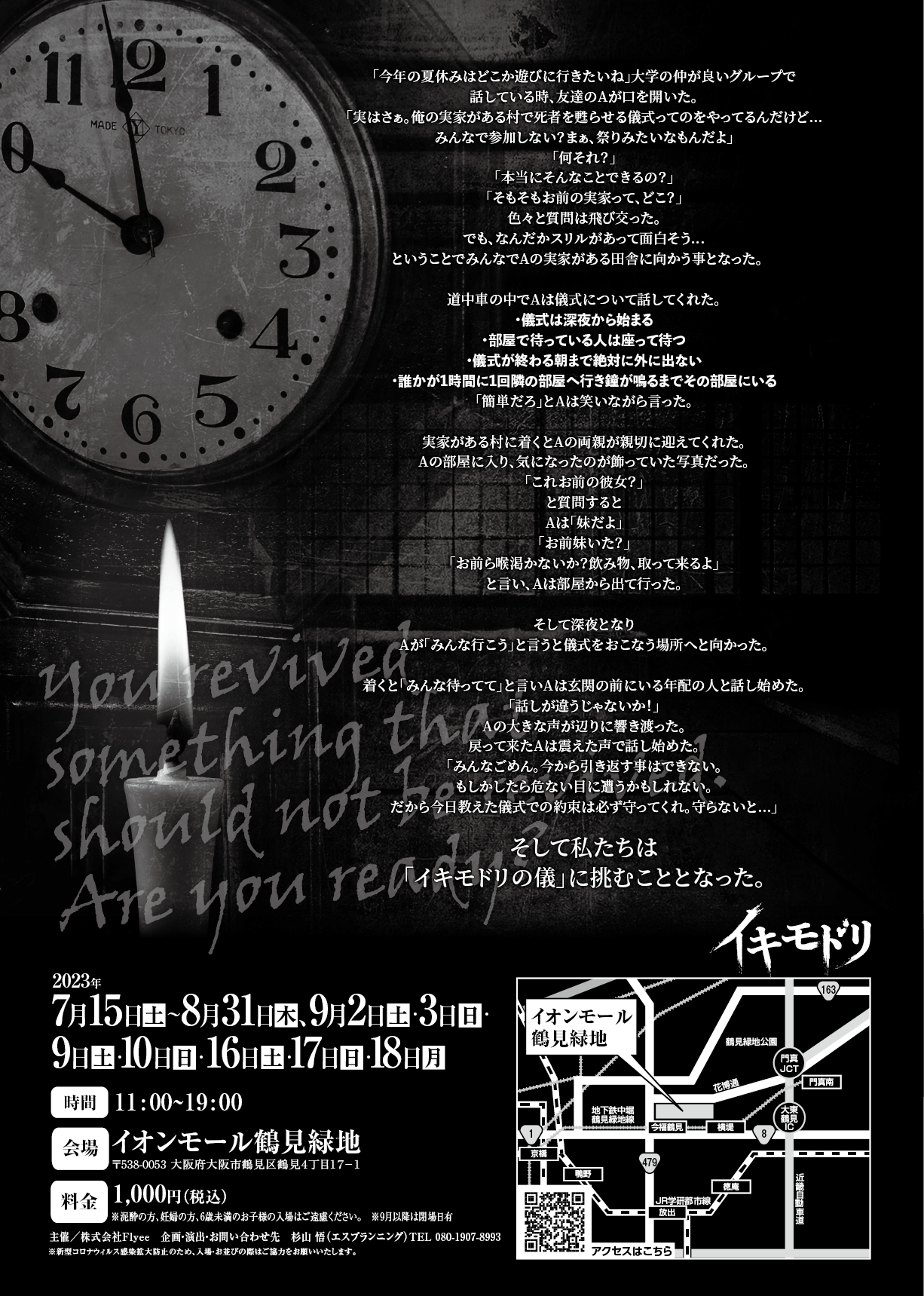 イベント企画 エス・プランニング(所在地:広島県広島市、代表:杉山 悟)は、夏季限定のお化け屋敷を大阪でダブル開催することが決定いたしました。第1弾は2023年7月15日(土)~9月18日(月祝)の期間中、イオンモール鶴見緑地2階特設会場にて「イキモドリ」を開催。第2弾は2023年7月22日(土)~9月18日(月祝)にイオンモール堺鉄砲町2階特設会場で「アカイヘヤ」を開催いたします。(※いずれも9月は平日休業)