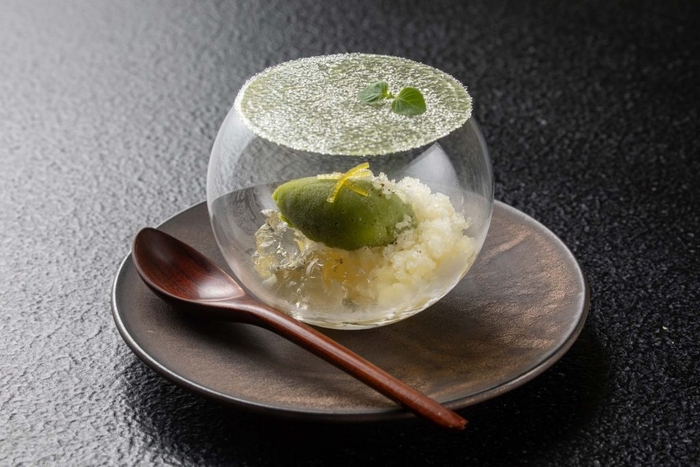 爽やかな酸味と上品な甘さが特徴の「小夏」、夏が旬の「大葉」を使ったさっぱりとしたデザートです。小夏のグラニテ(フランス料理で、果汁と砂糖で作った氷菓子)と日本酒のジュレ、大葉のアイスクリームを合わせることで、程よい甘味と酸味を楽しめます。