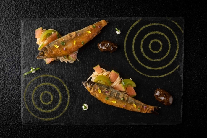約6時間コンフィ(食材を油に浸し、じっくりと煮るフランス料理の調理技法)した鮎を、パートブリック(小麦粉で作られた薄い皮)で包み、焼き上げた独創的な一皿です。頭や骨まで味わえるほど柔らかな鮎の身と、パリパリとしたパートブリックの食感のコントラストが特徴です。鮎の内臓を発酵させて作る発酵調味料「黒うるか」と、黒オリーブやにんにく、ケッパーなどをあわて作った、程よい苦味と酸味のあるタプナードソースを付けながら味わいます。付け合わせとして、スイカのピューレやグリーントマト、ビネガーを使った爽やかな風味のスイカのカッペリーニを提供します。