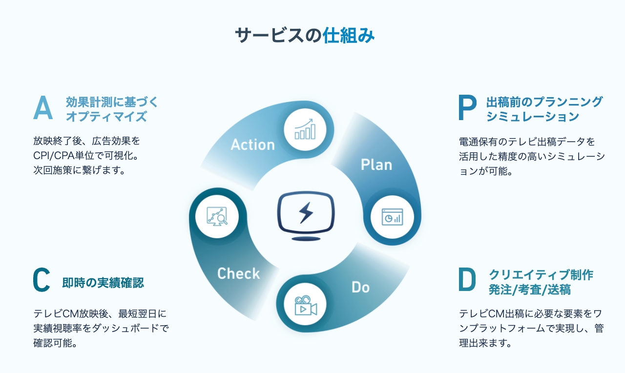 「テレシー」は、最低100万円から簡単にテレビCMの出稿ができ、効果もしっかりと確認しながらPDCAを回すことができる次世代型テレビマーケティングプラットフォームです。電通が保有する日本最大級のテレビCMに関わるアセットをフル活用し、AIを用いた高精度なシミュレーション・最適化・レポーティングを実現します。配信実績も独自のレポーティングツール「テレシーアナリティクス」により、最短で広告掲載翌日には把握することができ、シミュレーションデータと比較しながら、AIによるチューニングでさらなる最適化を図ることも可能です。