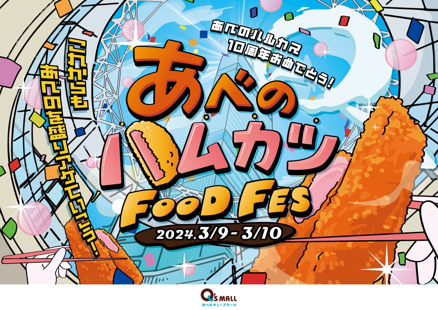 また、3月9日(土)、3月10日(日)の2日間は、「あべのハルカス」の語呂にちなみ「あべのハムカツ」フードフェスをあべのキューズモール2階「アーバンアベニュー」にて開催します。