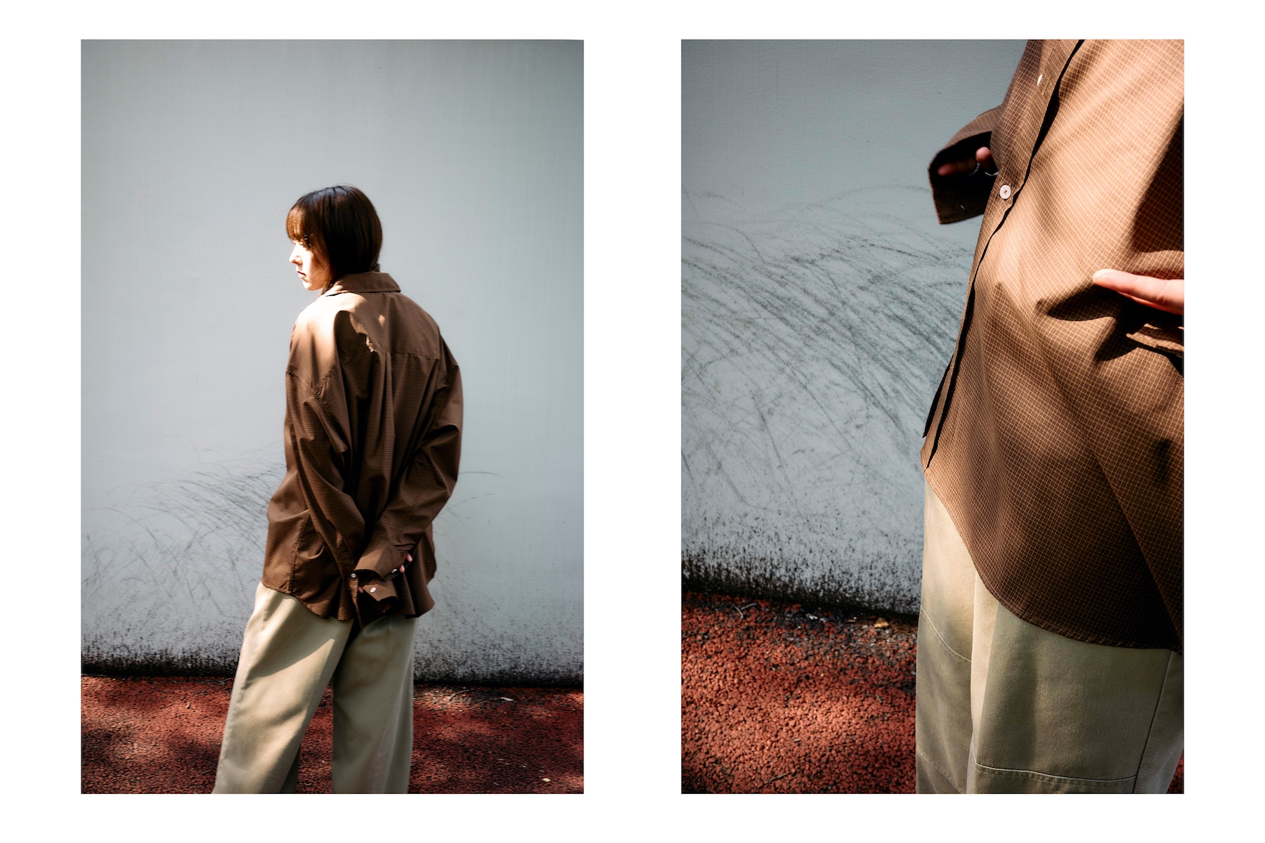 LOOK2~3のセットアップのスタイルは、風を孕むような軽やかさと、実用的なスペックが同居するルックに仕上がった。