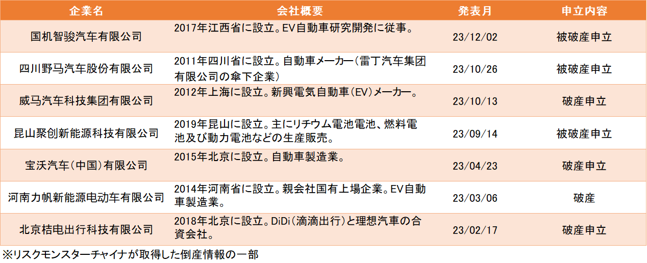このように、新エネルギー車の分野で好調の中国ですが、売上を伸ばし成長する企業がある一方で、新興自動車メーカーの倒産が発生しています。リスクモンスターチャイナが独自に収集している2023年度の倒産情報では、2010年以降に設立された、新興自動車メーカー、自動車関連メーカー7社が破産申立などの倒産手続きを行っています。(図表3)