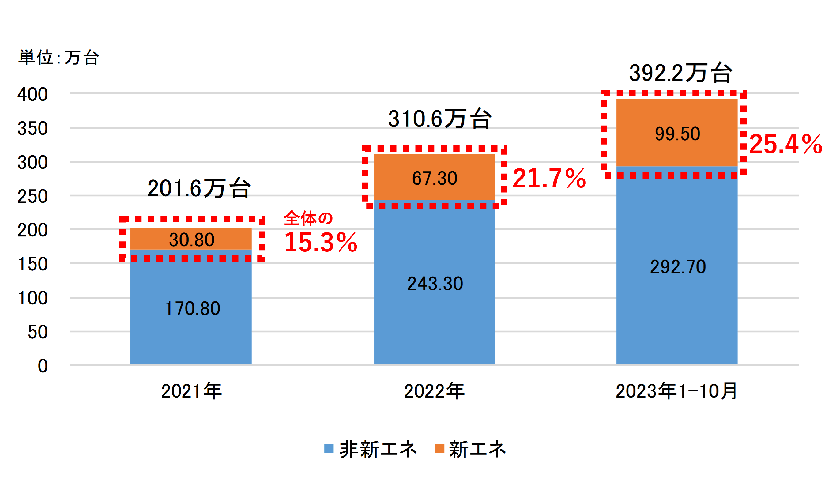 このような、中国の自動車輸出の増加をけん引しているのは、新エネルギー車です。中国での新エネルギー車の自動車輸出台数(図表2)は、2021年から連続して増加し、2023年1~10月の輸出台数全体に占める新エネルギー車の割合は25.4%と、自動車輸出台数の4分の1を占めています。