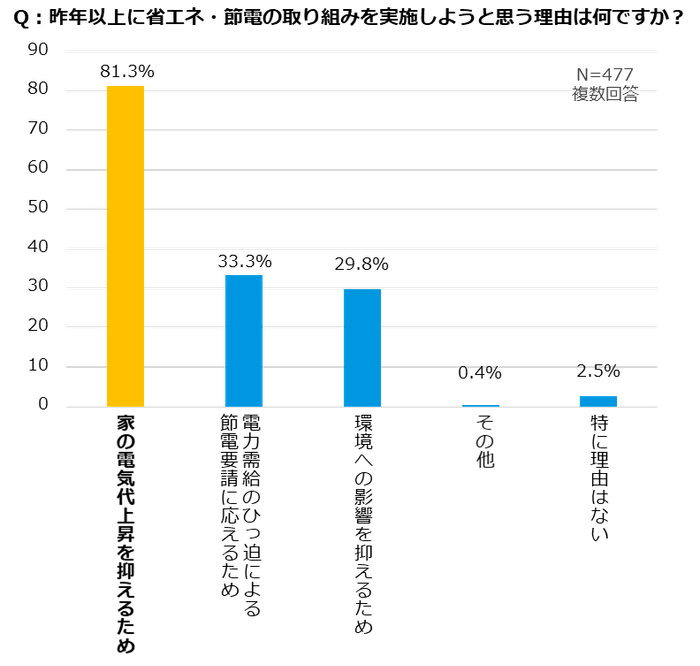 省エネ・節電に積極的に取り組む理由を聞いたところ、約8割(81.3%)の人が「家の電気代上昇を抑えるため」と回答し、他の項目を大きく抑えて最も多い結果となりました。節電要請に応えたい気持ちや、近年高まりつつある環境への意識がありつつも、現状では日常の生活と密接にかかわる「電気代の上昇」を強く意識している人が多いようです。