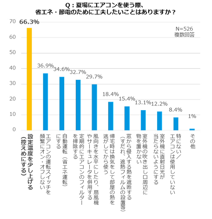 一方で「定期的にエアコンのフィルターを掃除する(32.7%)」、「室外機の吹き出し口周辺に物を置かない(13.1%)」など、その他の工夫ポイントについては1~3割程度の実施にとどまっており、まだまだ工夫の余地は大きいと言えそうです。これからこうした節電術が多くの人に取り入れられることで、無理のない省エネ・節電習慣になっていくことが期待されます。