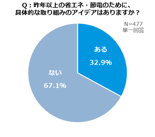 それでは、人々はどのよう省エネ・節電に取り組んでいこうとしているのでしょうか。「昨年以上の省エネ・節電のために、具体的な取り組みのアイデアはありますか?」との質問には、「ない(どうすればいいかわからない、これから考えたい)」と回答した方が約7割(67.1%)という結果となりました。近年の省エネ、環境意識の高まりの中で、すでにさまざまな形で省エネ・節電の工夫している人も多いことが考えられます。昨年以上の節電が難しい中、今まで取り組めていなかった新たな節電術に関する情報のニーズは大きそうです。