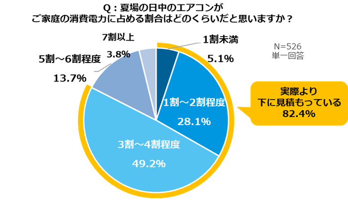 夏の電力需給に影響の大きいと考えられるエアコンの消費電力について、一般の方々には正しく理解されているのでしょうか。「夏場、一番消費電力が大きい家電」として約7割(74.7%)の人が「エアコン」と回答し、最も多い結果となりました。一方で、夏場の日中(ピーク時)におけるエアコンの消費電力の割合を「5~6割程度」と正しく回答できた人は約1割(約13.7%)と少なく、昨年同じ質問をした際 (13.4%)と大きく変わりませんでした。まだまだ多くの人がエアコンの消費電力を少なく見積もっているようです。エアコンの消費電力について正しい知識を身に着けることが、節電と環境貢献への第一歩かもしれません。