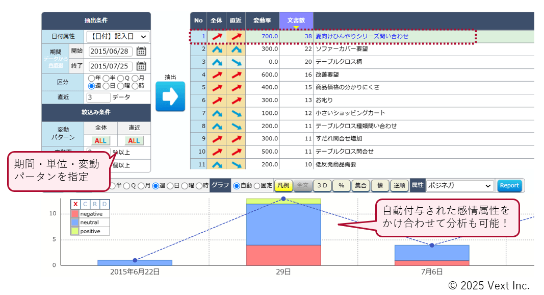分析対象の期間・単位・変動パータン(増加・減少)を指定することで、話題の時系列変動を確認することができ、急増する注目すべき話題の発見や早急に対処すべき話題の予兆監視に役立ちます。また、グラフはLLMにより付与された感情属性と掛け合わせて表示させることもできます。