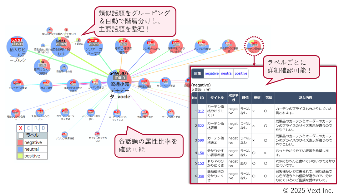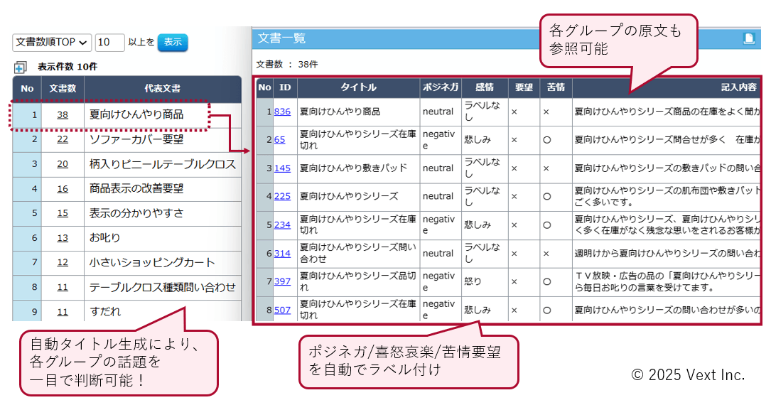 ベクスト独自のテキストマイニング技術によって類似話題をグルーピングし、データ中の話題を多い順に並べたランキング結果を確認できます。ワンクリックで各グループの原文を参照し、LLMによって生成された各話題のタイトルや感情属性を確認することもできます。