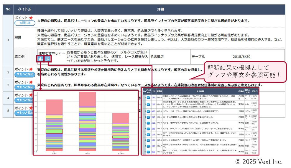 VextMinerによる分析結果から、重要なデータ特徴を自動でピックアップし、それぞれの特徴に対する想定要因や改善アドバイスなどを丁寧な解説文で生成します。どのグラフのどのようなポイントについて解釈を行ってほしいかは分析者自身が指定することができ、個々の分析目的に合わせた活用が可能になっています。また、生成された解説は、その根拠となった分析結果の対応箇所やデータの原文(全件)をワンクリックで確認でき、生成AI特有のハルシネーション(=事実に基づかない情報)チェックが可能です。