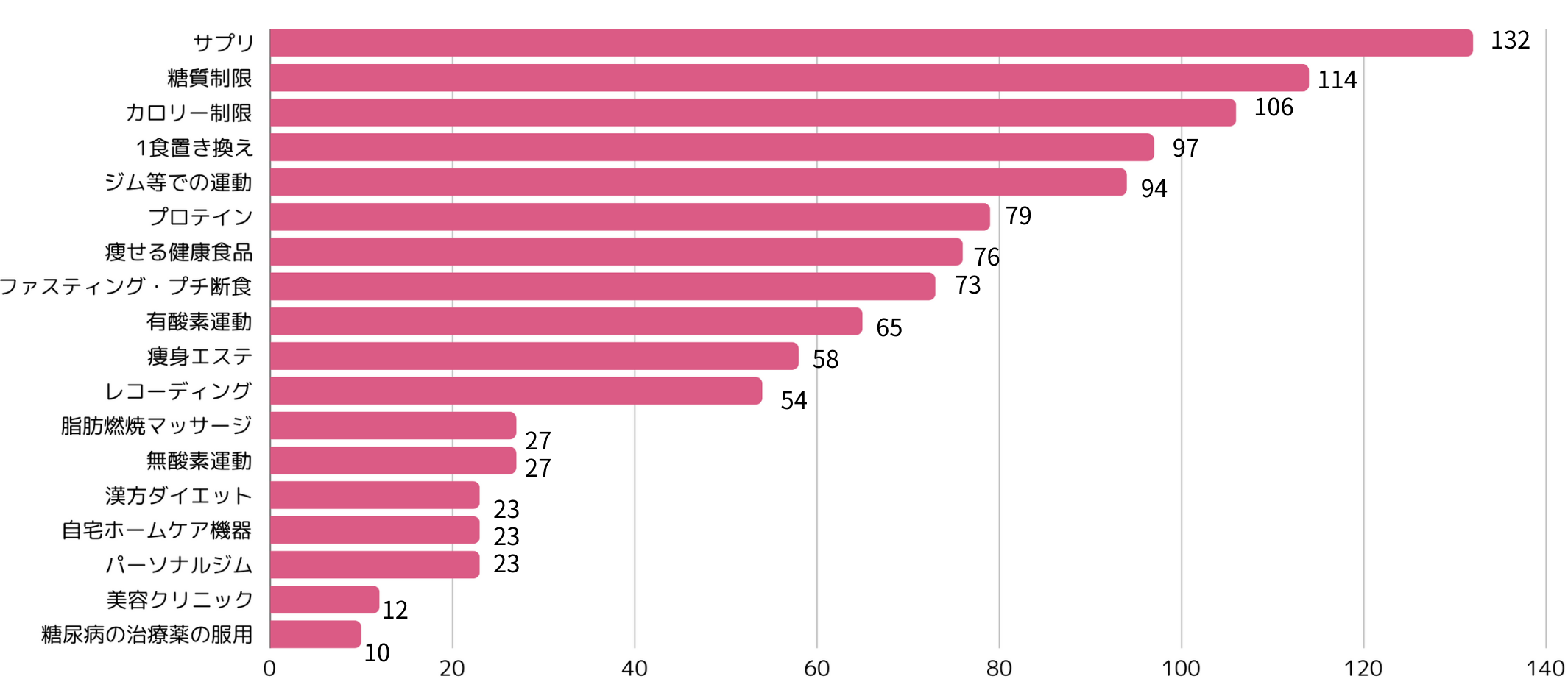 ・ダイエット方法のTOP3は「サプリ(64.4%)」、「糖質制限(55.6%)」、「カロリー制限(51.7%)」