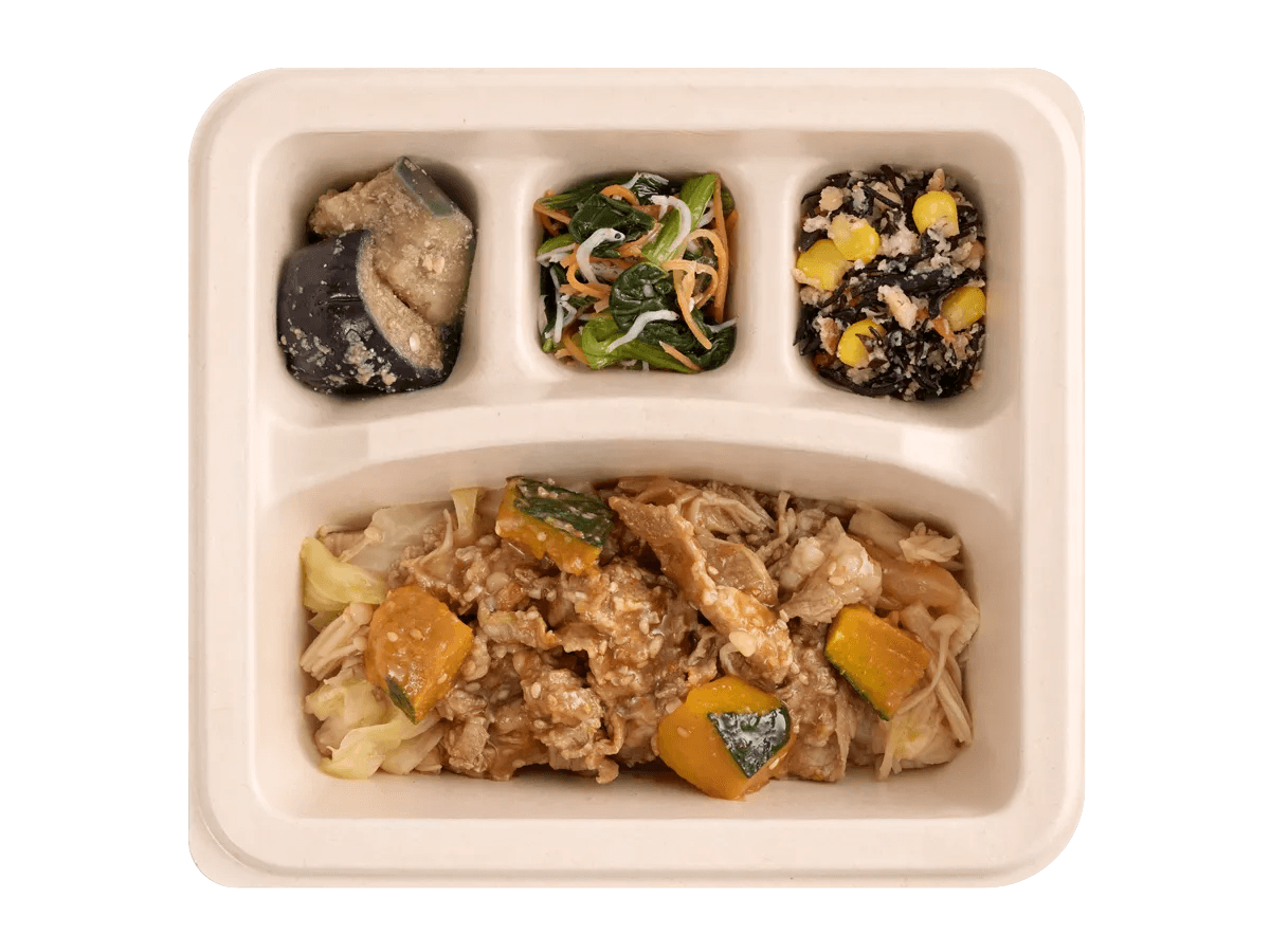 おいしさを感じていただけるよう、メインの牛肉には本醸造醤油のもみだれを絡め、さらにコクと風味のある特製焼肉のたれをかけています。キャベツ、えのき、かぼちゃと一緒にお召し上がりください。