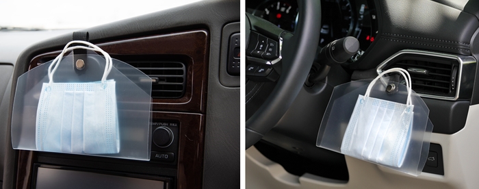 車では、ホルダーをカークラーの前に置いて、マスクを冷やしたり乾燥させたりできます。