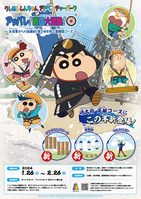 ニジゲンノモリの人気アトラクション「クレヨンしんちゃんアドベンチャーパーク」では、入場チケットを事前に予約購入されたお客様全員へオリジナルクリアファイルを、明後日1月26日(金)の入場券より配布いたします。クリアファイルのデザインはシーズンによって変更となり、今回は冬にピッタリのイベント「アッパレ!戦国大冒険!」超難関“新エリア”のビジュアルが描かれています。クリアファイルは、ニジゲンノモリで遊んだ思い出になるだけでなく、謎解きキットなどのグッズを雨から守るためにも大活躍!