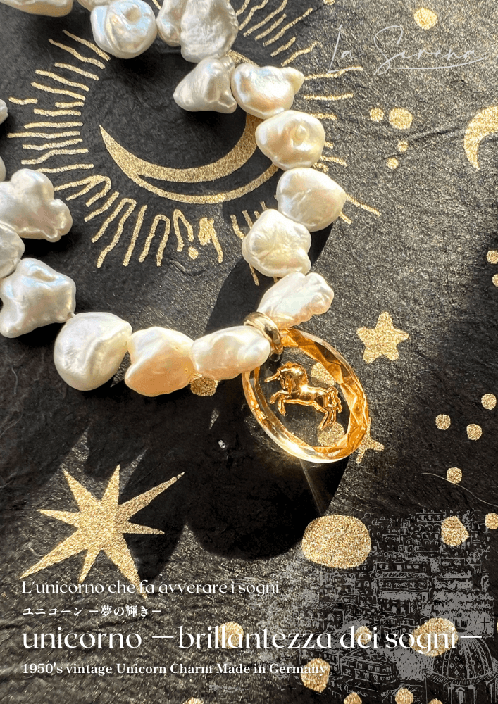 創業から4回目のクリスマスを迎えたことを記念して、“ユニコーン -夢の輝き-”と名付けられたネックレスは、ドイツ製ヴィンテージガラスのユニコーンチャームと淡水パールで仕立てられています。