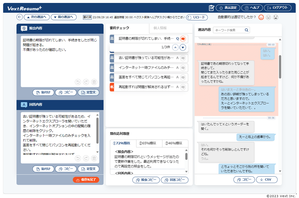 VextResumeは2011年より販売開始したベクスト独自の自然言語処理(NLP)技術で音声認識結果を自動要約し、オペレーターの応対履歴入力を支援するコンタクトセンター向けソリューションです。「VextResume+ powered by ChatGPT(β)」は近年の大きな技術ブレイクスルーにより登場したChatGPTの推論能力を活用することでテンプレート作成が不要の高精度な要約を実現し、人間工学に基づくUI/UXデザインでオペレーターのACW(アフターコールワーク)を強力に支援します。当社独自のテキストマイニング技術と分析ノウハウを活用することで生成AI特有のハルシネーション(=事実に基づかない情報)を最終応対履歴に残さない運用を可能にしています。また、音声認識テキストに含まれる個人情報は、自動マスキングを行った上でAzure OpenAI Service上のChatGPT APIへリクエストを行うことで、高セキュリティ・高可用性を実現しています。