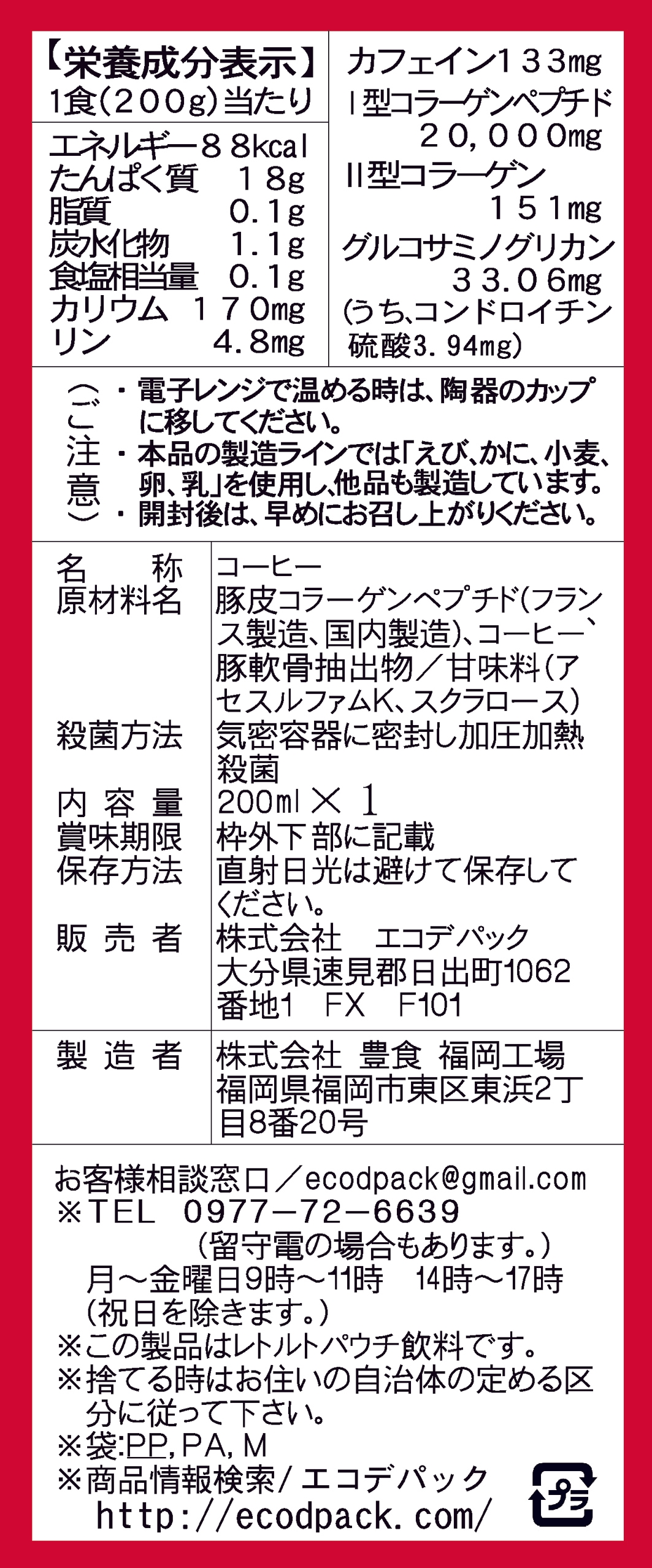 株式会社エコデパック(所在地:大分県速見郡、代表取締役:重岡 孝士)は、レトルトパウチのコラーゲン飲料「コラーゲン カフェ」を、2022年4月21日に発売いたします。