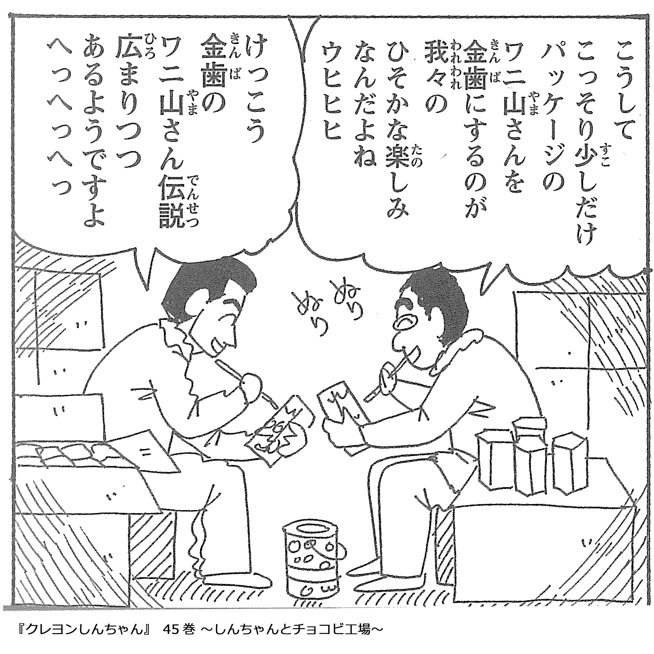 小学生になったしんのすけが、チョコビを製造している東ハト工場に社会科見学へ行き、作られていく工程を学びます。美味しいチョコビが作られている裏では、夜な夜な工場長がこっそりパッケージのワニ山さんの歯を金色に塗っている…そんなお話です。