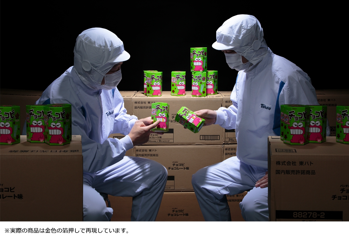 この仕様は漫画・アニメ『クレヨンしんちゃん』にて描かれた設定を、実際の商品でリアルに再現したもので、漫画『クレヨンしんちゃん』の45巻に収録された「しんちゃんとチョコビ工場」のストーリーの中で生まれた設定です。