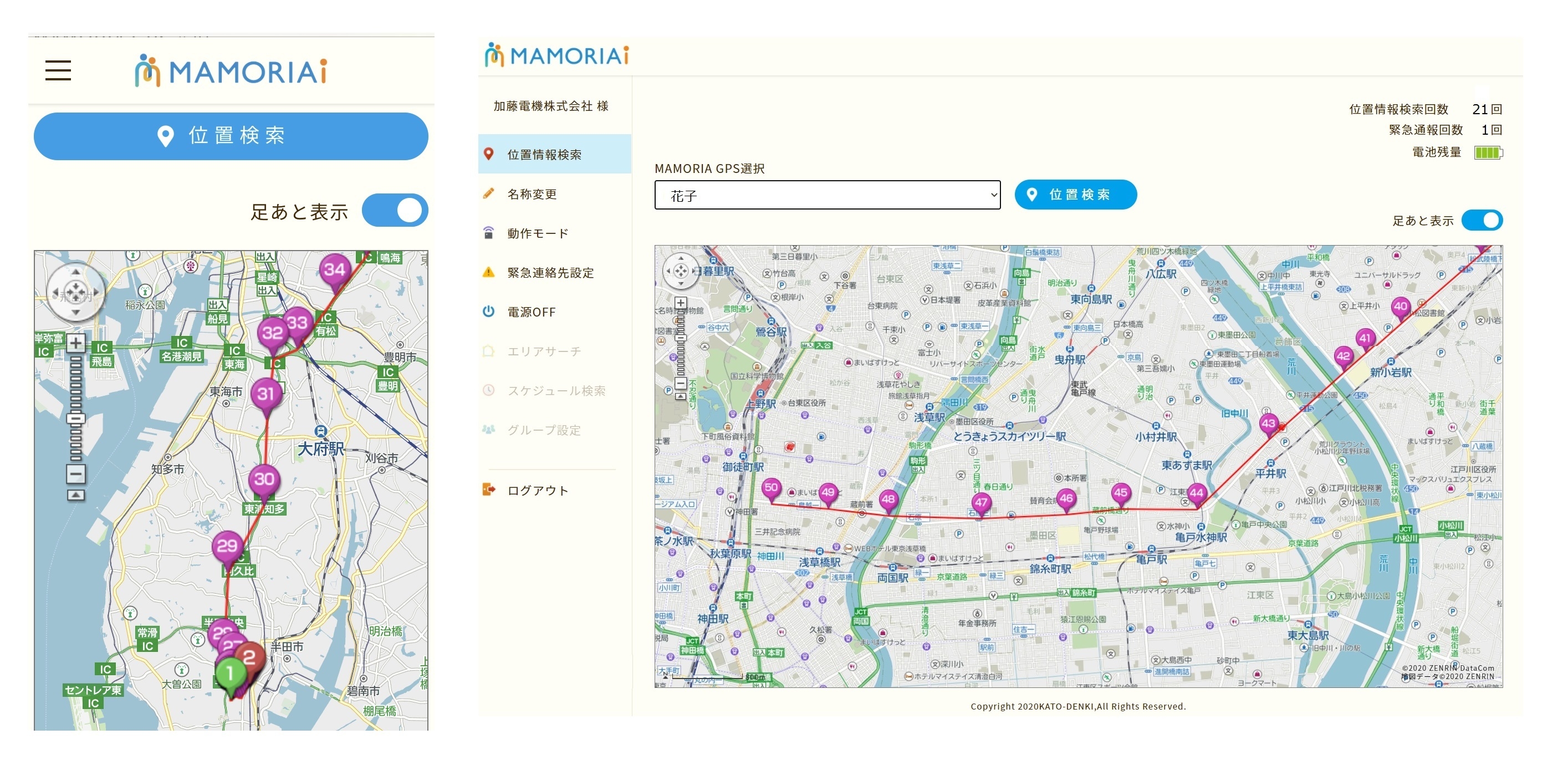 「足あと表示」機能は、取得した位置情報をMAMORIA GPSでは50箇所まで表示しますが、厳密なトレーサビリティユースでは数万件(※1)までさかのぼって履歴表示が可能です。