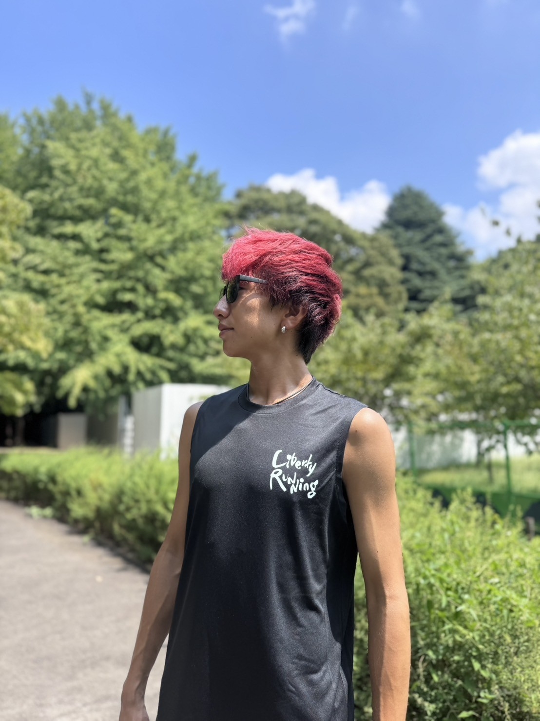こわだ君が掲げる、「Liberty Running」「リバティーランニング」「自由走人」がプリントされたノースリーブ3種と、赤い髪のキャラクターで親しまれている、こわだ君がモチーフのイラストがプリントされたビブス留め1種を販売します。