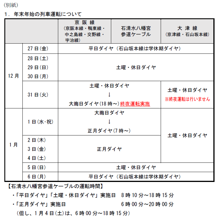 京阪電気鉄道株式会社(本社:大阪府枚方市、社長:平川 良浩)では、京阪線と石清水八幡宮参道ケーブルにおいて、大晦日の終夜運転を実施します。また、元日から1月4日(土)にかけて初詣や初春のお出かけに便利な正月ダイヤで列車を運転します。