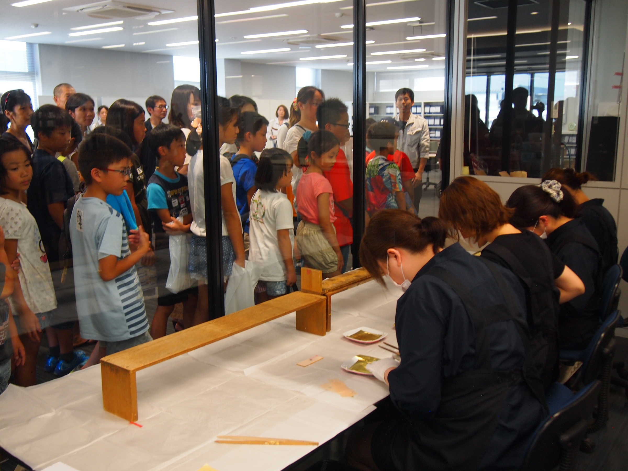また、見学会の後半では、ご自宅で簡単にできる体験キット「キャンディー金箔体験」と「のりで簡単金箔体験」の2種をご用意しました。金箔体験の楽しさもご自宅で気軽に体験していただけます。後日、ご参加のお子様には『金箔博士認定証』を授与し、夏休みの思い出となるようお手伝いさせていただきます。