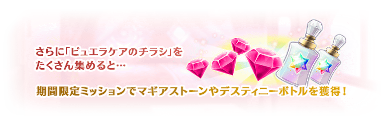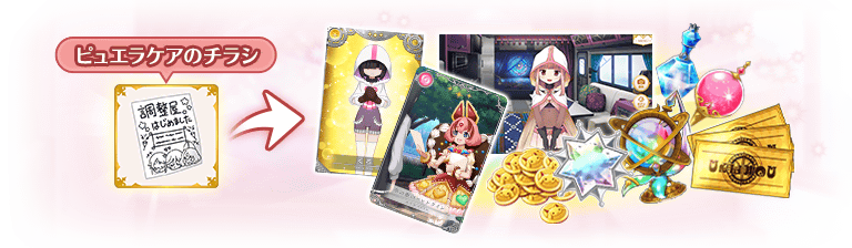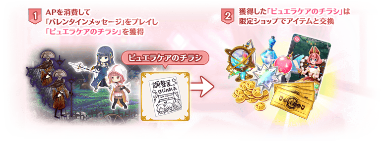 本イベントで獲得した「ピュエラケアのチラシ」は新魔法少女「くろ(CV.城内由茄子)」や限定メモリア「草の根のバレンタイン」限定ホーム背景「バレンタインメッセージ」「ガチャチケット」「バレンタイン交換チケット2023」等の貴重なアイテムとも交換できます。