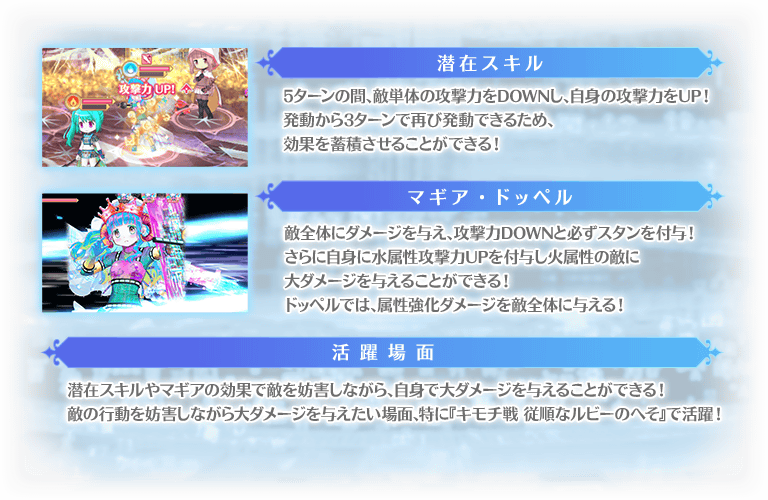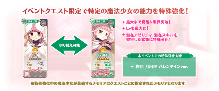 対象の魔法少女を編成して本イベントクエストをプレイする際にステータスを特殊な状態に強化することができます。