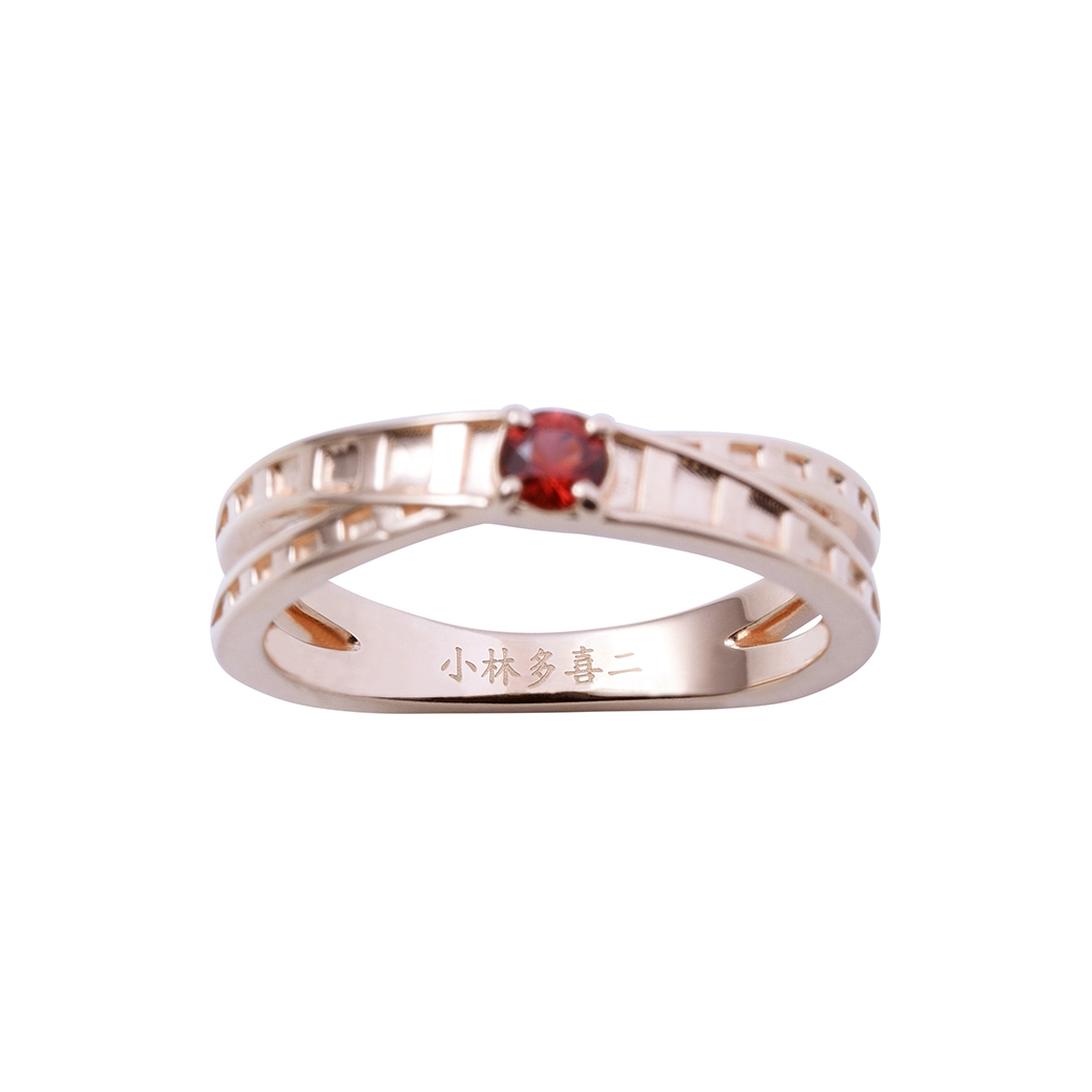 ピンクゴールドコーティングを施した表面にはイメージカラーストーン、内側には名前を刻印しました。