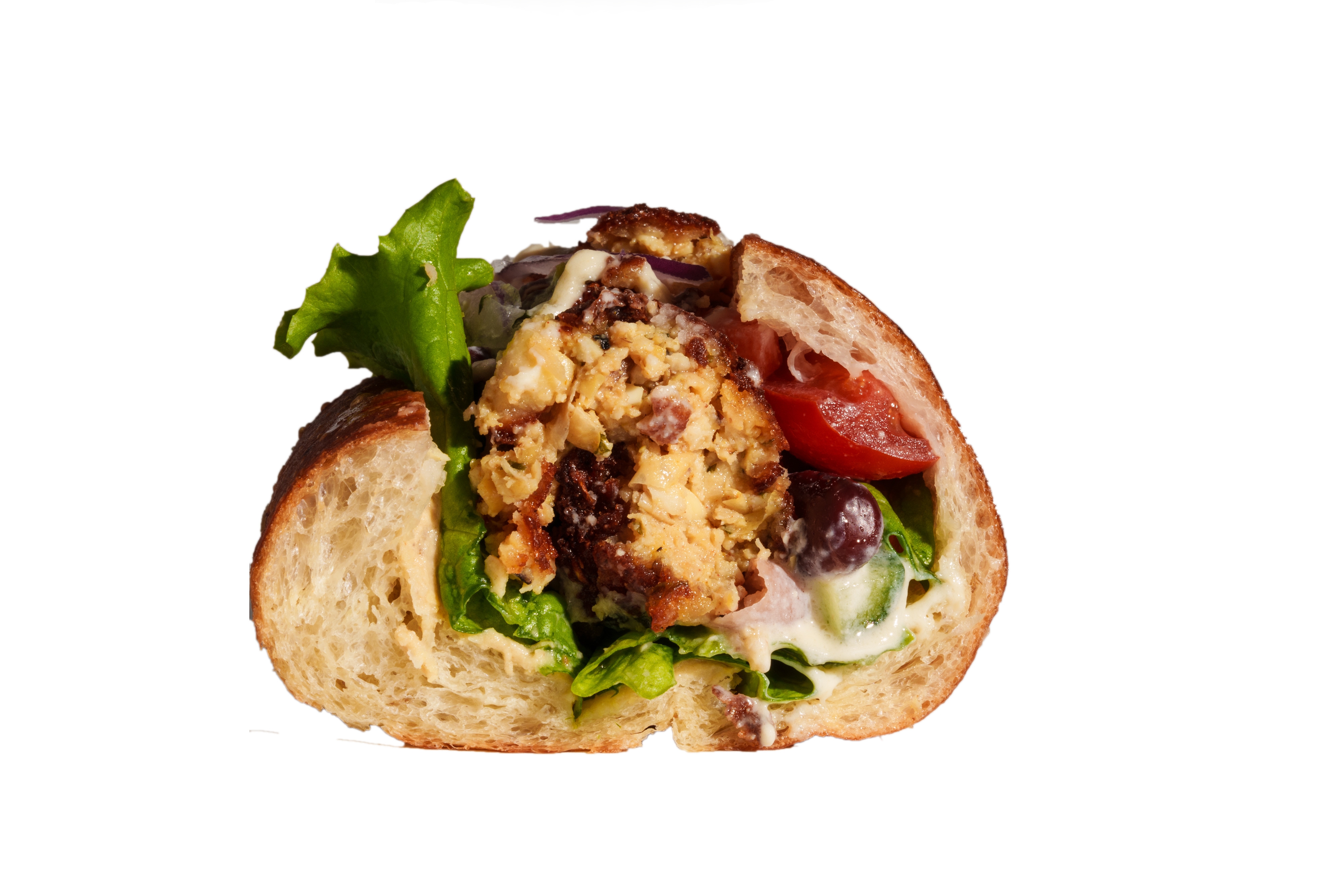 特徴 :ヴィーガン。あぐりこ園の自然栽培大豆とひよこ豆で作ったファラフェル(コロッケのようなもの)にソースは自家製カシューナッツマヨとフムス。ヴィーガンでも食べ応えは十二分です。