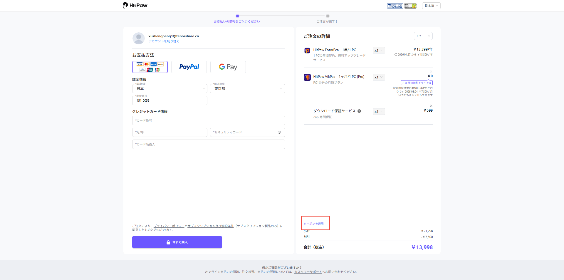 - プランを確認し、購入ページの右下にある「クーポンを適用」をクリックします。