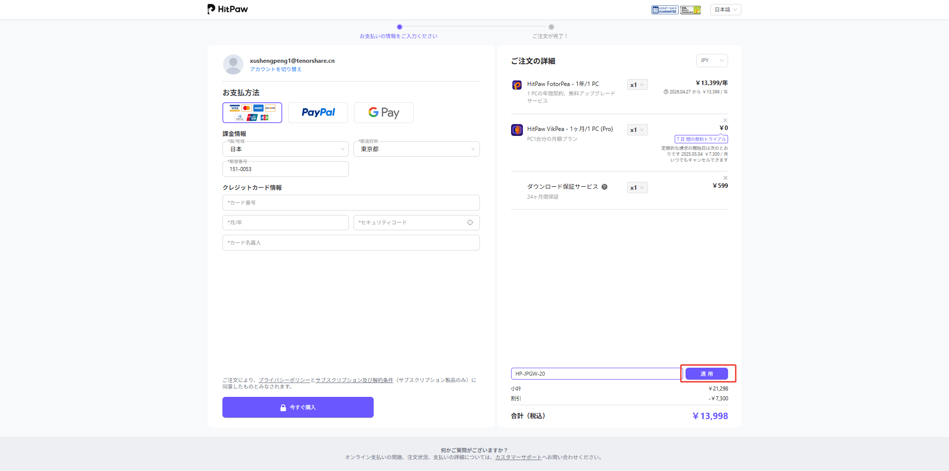 - クーポンを貼り付ければ、適用をクリックして、クーポンが有効になります。