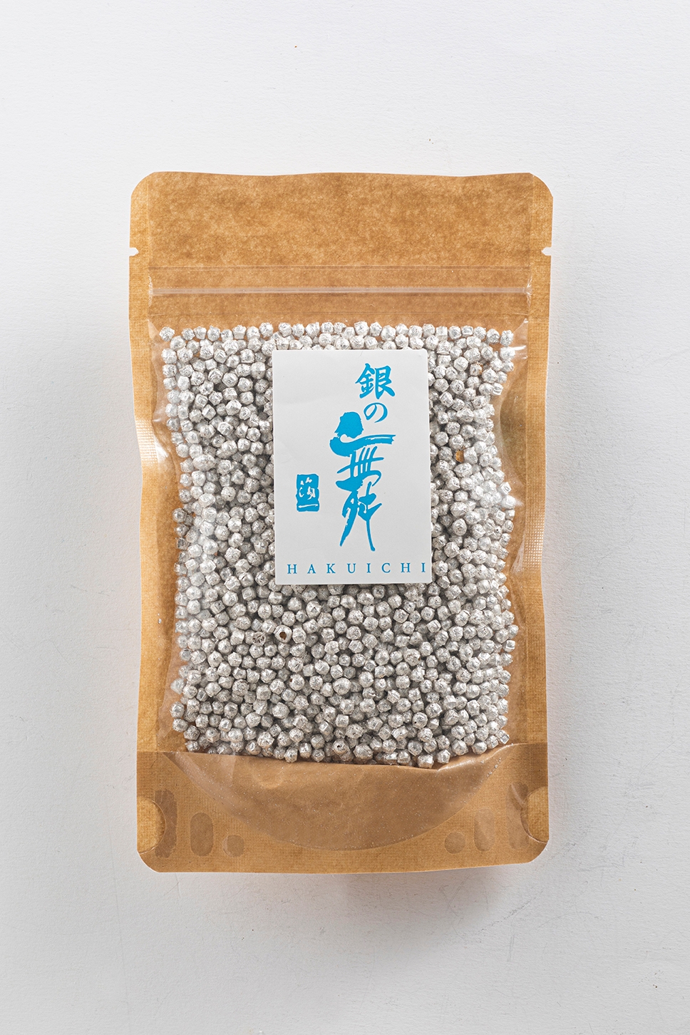 こちらの3種の商品のベースとなるのは、京都発祥の「ぶぶあられ」です。『金箔あられ』『銀箔あられ』は、お茶漬けにかかせないもち米を香ばしく焼き上げた小さな丸いあられに、それぞれ金箔と銀箔を施しました。『銀箔カラフルあられ』は、五色のカラフルなあられの一部に銀箔を施したものを混ぜ、輝きと色合いの可愛らしさが特徴の食用金箔です。