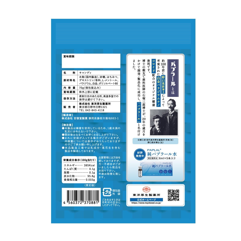 健康志向の高まりとともに、のど飴にも新たな価値が求められています。株式会社東洋厚生製薬所(本社:東京都日野市、代表取締役社長:輪嶋 将一)は、プラチナを配合した「パプラールのど飴」を装いも新たに2025年4月14日(月)に販売を開始いたします。“パプラール”とは野口英世博士が約100年前に考案した、プラチナ(白金)とパラジウムをナノコロイド化したオリジナル成分の名称です。喉の潤いをサポートするだけでなく軽やかな毎日へ、ワンランク上の“のど飴”体験を提供します。