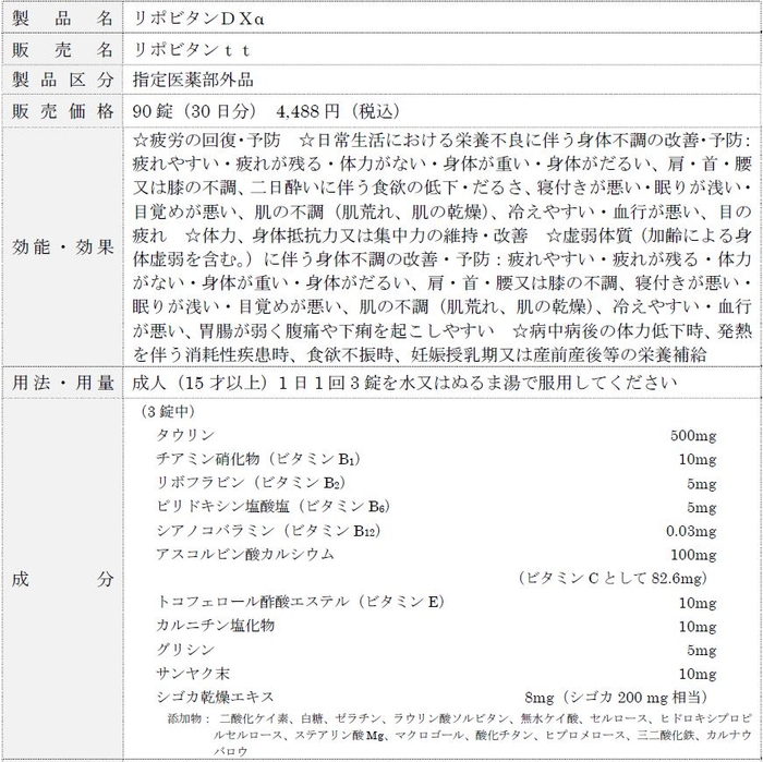 「リポビタンDXα」は、タウリンやビタミンB群(B1,B2,B6,B12)、ビタミンC、ビタミンEを配合したビタミン剤です。タウリンとビタミンB1,B2,B6がエナジーサイクルに働きかけ、からだ全体の疲れを回復に導きます。日々の疲れだけでなく、加齢によって疲れやすいと感じる方や冷えでお悩みの方におすすめしたい製品です。また、日々の生活に取り入れやすいよう、錠剤の飲みやすさにもこだわった直径約9mmの小型フィルムコーティング錠となっています。
