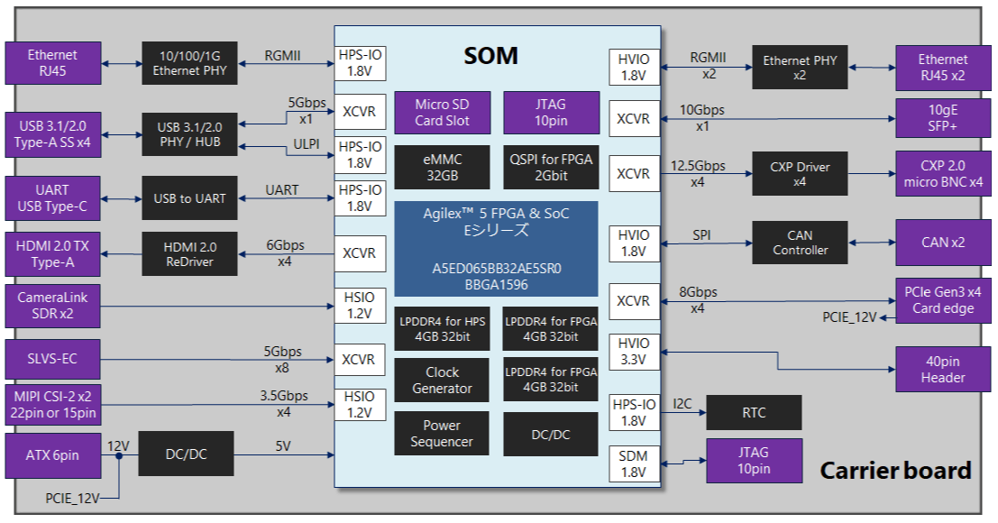 「Sulfur」は、国内初の Agilex™ 5 FPGA & SoC Eシリーズを搭載した評価ボードです。お客様のシステムに組み込めるSystem On Module(以下SOM)と、豊富なインタフェースを搭載したキャリアボードをセットにした、開発評価フェーズと量産設計フェーズの両方に最適なプラットフォームです。
