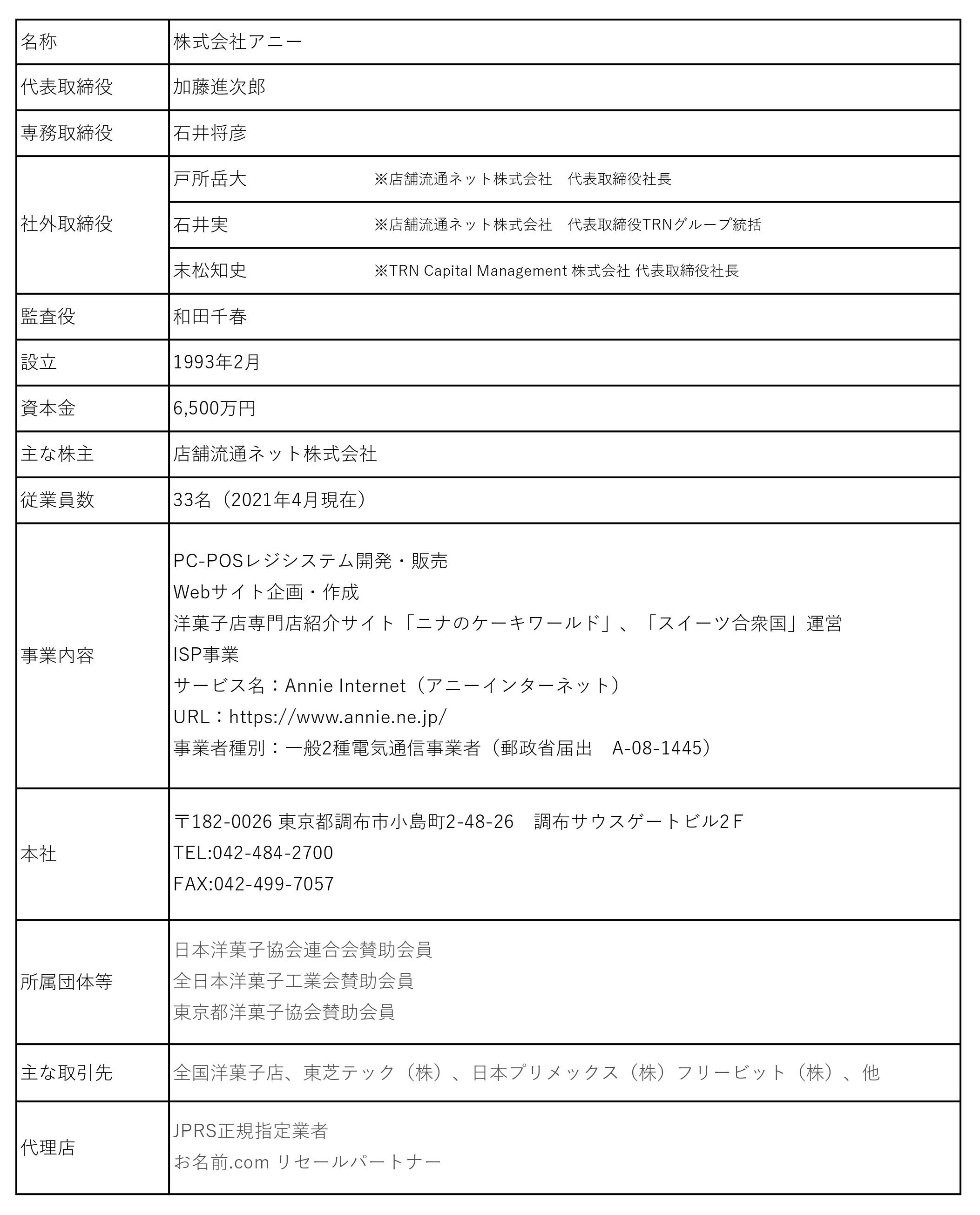 店舗流通ネット株式会社(東京都港区:代表取締役社長 戸所岳大)は、製菓・製パン店専用顧客管理POSシステムを提供する株式会社アニー(東京都調布市:代表取締役 加藤進次郎)の全株式を取得し、2021年3月1日に完全子会社化いたしました。これに伴い、役員人事についても下記に就任いたしました。
