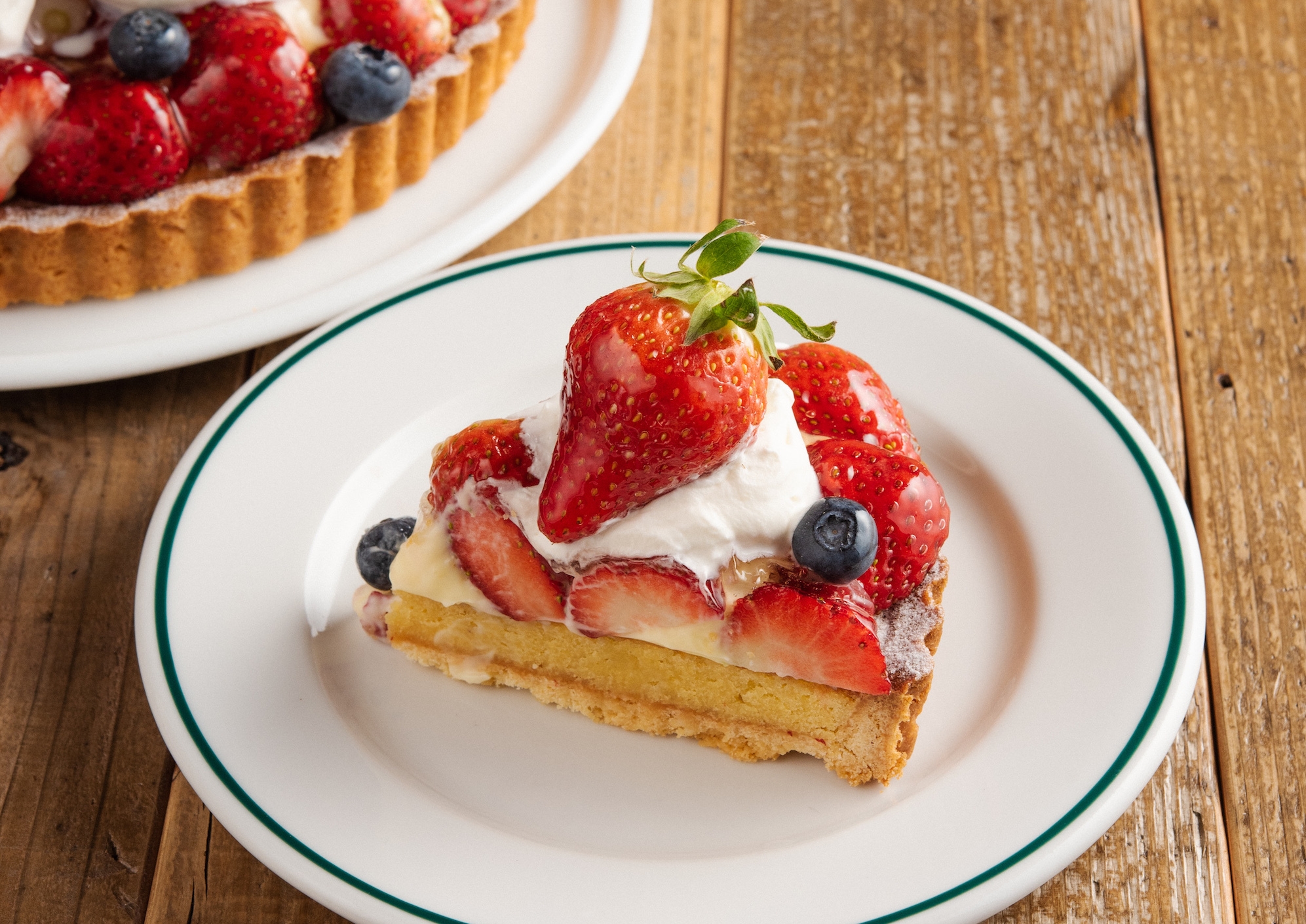 苺を溢れるほど贅沢に盛り付けたタルト。タルトの中心には、ピスタチオのペーストとカスタードクリーム、ホイップクリームを合わせたクリームがたっぷりとサンドされています。