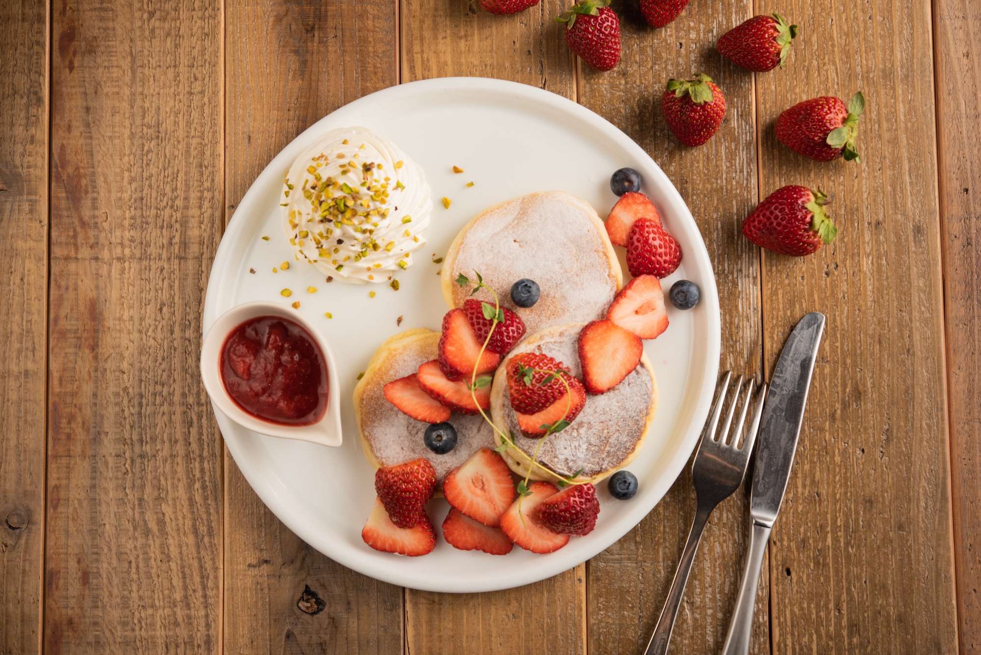 全粒粉入りのあっさりとしたパンケーキ生地を、生クリームの甘さ、ピスタチオの食感、さらにフレッシュな苺、甘酸っぱい自家製苺ソースをかけて楽しむことができる一品。