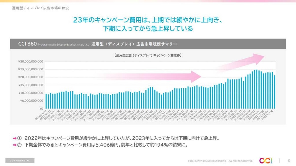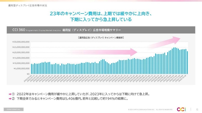 2023年下期の運用型ディスプレイ広告におけるキャンペーン費用は急上昇。前年と比較すると倍増している。