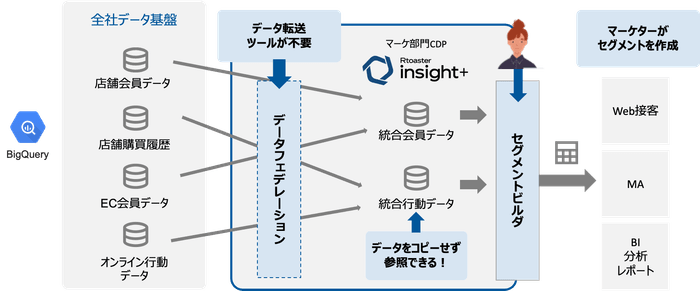 「Rtoaster insight+」を使用するマーケターは、データ連携に手間をかけることなく「 Google BigQuery 」に集約した顧客データを直接「Rtoaster insight+」にて利用できるようになるため、本機能は、データ基盤を管理するIT部門とマーケティング部門の双方にとって大きなメリットを生みます。