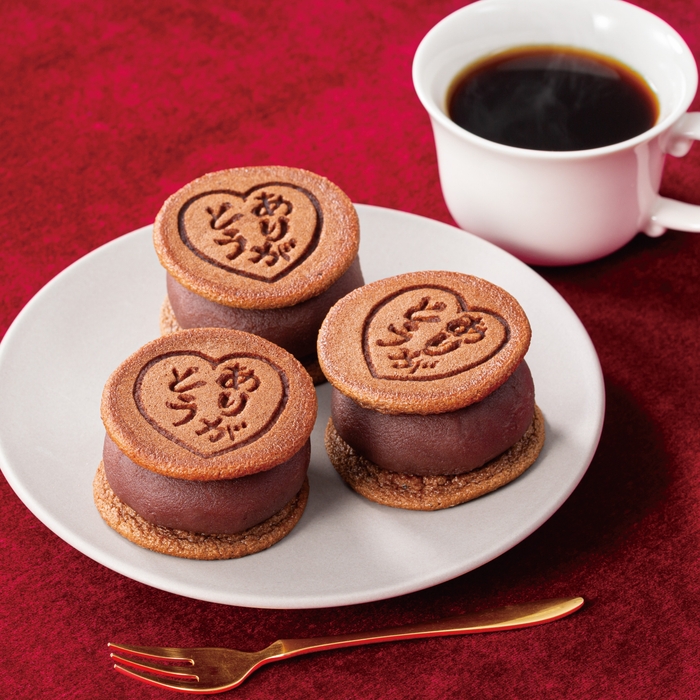 チョコレートソースを包んだ風味の良いこしあんを、しっとりとしたチョコどら焼生地で挟んだ小ぶりなサイズのどら焼です。ありがとうの焼き印入りで日頃の感謝を伝える御礼チョコにもピッタリの逸品です。