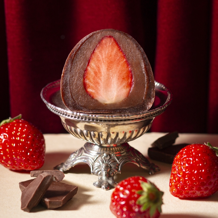 香り高いフランス産ショコラを使用した餡とコク深いビターショコラ餅が奏でる贅沢な味わいのフルーツ大福。甘酸っぱい旬のとちおとめがショコラの甘さを引き立てます。