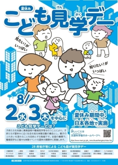 「こども霞が関見学デー」は、文部科学省をはじめとした28府省庁などが連携し、仕事内容の説明や省内見学などをとおして親子のふれあいを深め、子どもたちが夏休みに広く社会を知る体験活動の機会とするとともに、各府省庁などの施策に対する理解を促すことを目的とした取り組みです。2023年は、8月2日(水)と3日(木)の2日間にわたって開催されます。また夏休み期間中には、国の関係機関や各地方公共団体(都道府県・市町村)、民間企業等においても「こども霞が関見学デー」と同様の趣旨の取り組みが全国で行われる予定です。本イベントの開催にあたっては、オンラインでのプログラムも実施される予定です。