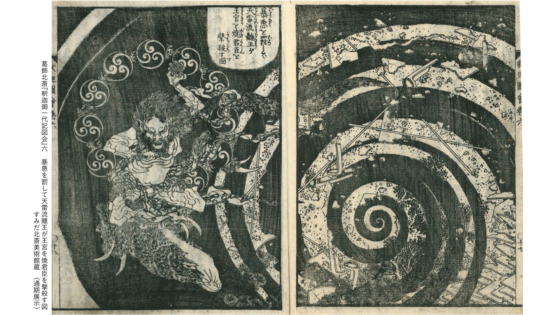 読本『釈迦御一代記図会』に登場する釈迦の伝記の一場面です。左に武器を振り上げて天罰の雷撃を落とす雷神、右に爆風渦巻く中に破壊される王宮を対比させるという、画面構成の大胆さが目を惹きつけます。北斎は、古来描き継がれてきた雷神にのっとり、雷神の背後に雷太鼓を描いていますが、乗り物は雲でなく雷獣に、顔は険しく恐ろしい形相とするなど、独自性を出しています。
